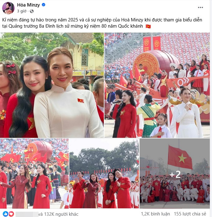Nữ ca sĩ viết: "Kỉ niệm đáng tự hào trong năm 2025 và cả sự nghiệp của Hoà Minzy khi được tham gia biểu diễn tại Quảng trường Ba Đình lịch sử mừng kỷ niệm 80 năm Quốc khánh."
