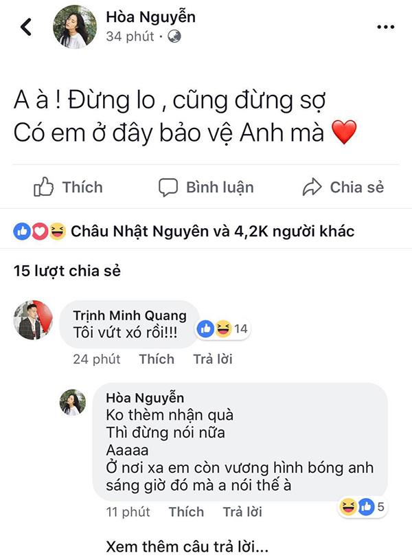 Ngay khi tình mới lộ diện, Hòa Minzy lên tiếng bảo vệ bạn trai trước những sóng gió ập đến. Trên trang cá nhân, nữ ca sĩ sinh năm 1995 nhắn nhủ bạn trai: "Anh à, đừng lo cũng đừng sợ. Có em ở đây bảo vệ anh mà".