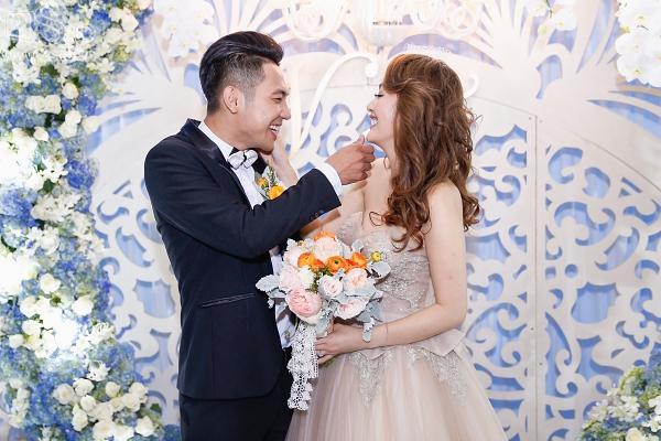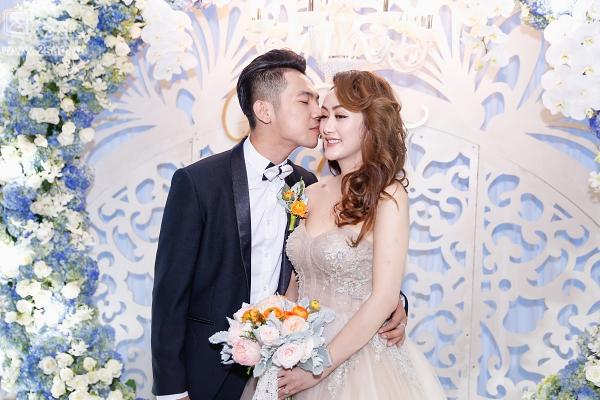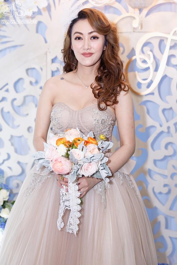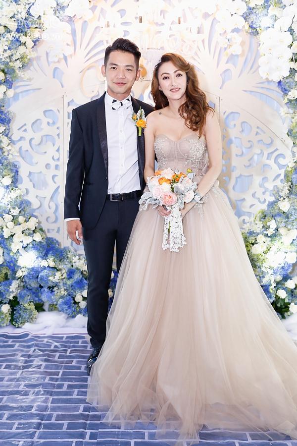 Bà xã của Mai Quốc Việt diện váy cưới màu pastel ngọt ngào trên nền chất liệu voan lụa mềm mại.