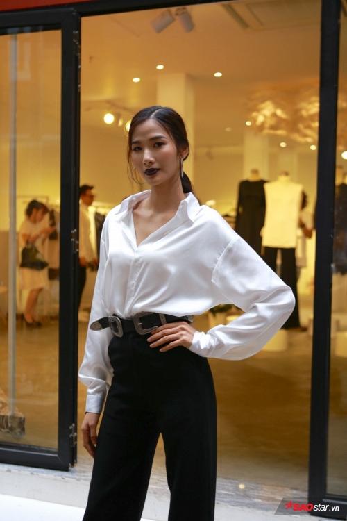 Hoàng Thùy diện style thời trang tinh tế với áo sơ mi trắng mix cùng quần tây ống rộng vô cùng tinh giản. Việc sử dụng thắt lưng tạo nên điểm nhấn thú vị cho set đồ, mang tới vẻ ngoài chỉn chu nhất của nữ huấn luyện viên The Face Việt Nam 2017.