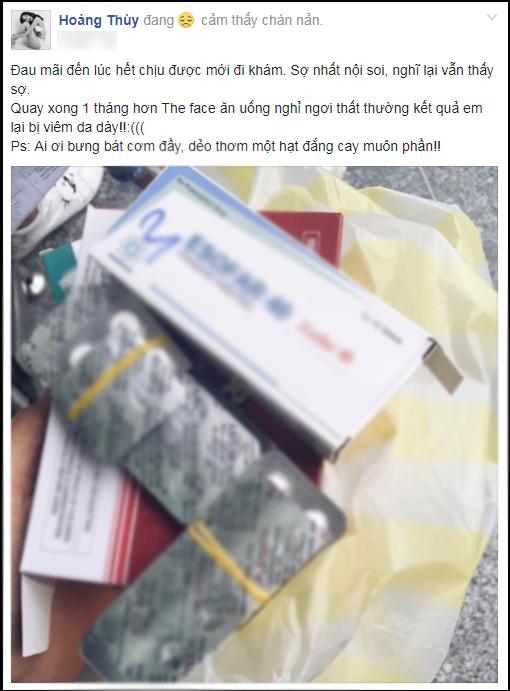 Theo chia sẻ của Hoàng Thùy, cô vừa đi khám nội soi và phát hiện ra bệnh viêm dạ dày tái phát. Nguyên nhân của căn bệnh bắt nguồn từ việc người đẹp ăn uống, nghỉ ngơi thất thường trong suốt một tháng ghi hình The Face 2017.