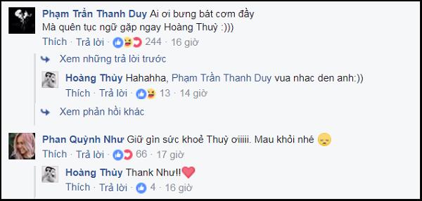 Phía dưới phần bình luận, ca sĩ Thanh Duy trêu chọc cô nàng bằng bình luận hài hước: "Ai ơi bưng bát cơm đầy. Mà quên tục ngữ gặp ngay Hoàng Thùy".