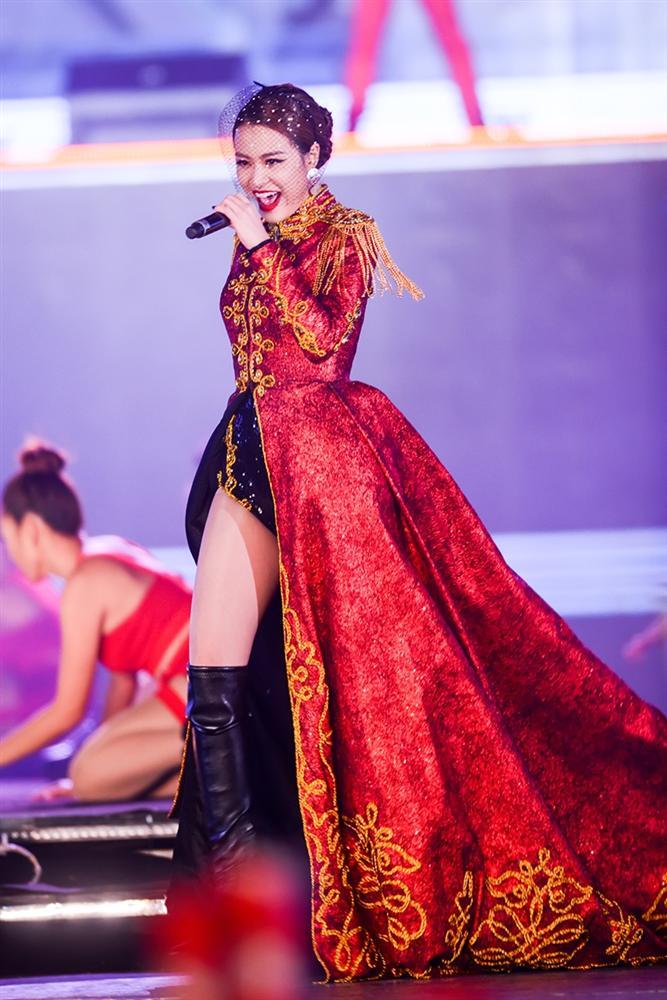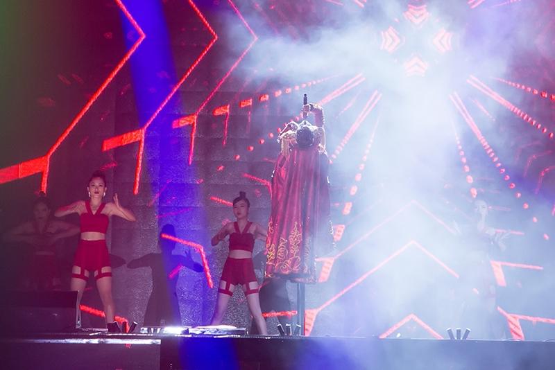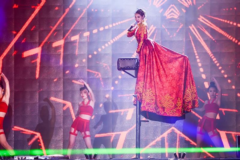 Trong đêm diễn tối qua nữ ca sĩ diện trang phục gồm có 2 phần đặc biệt được nhà thiết kế Lê Thanh Hoà dày công thực hiện. Phần áo choàng lấp lánh sắc đỏ tạo nên hình ảnh xuất hiện của Hoàng Thuỳ Linh trên sân khấu đầy mạnh mẽ và cá tính cùng với yên ngựa cao bồi được đạo diễn Việt Tú mang lên sân khấu.