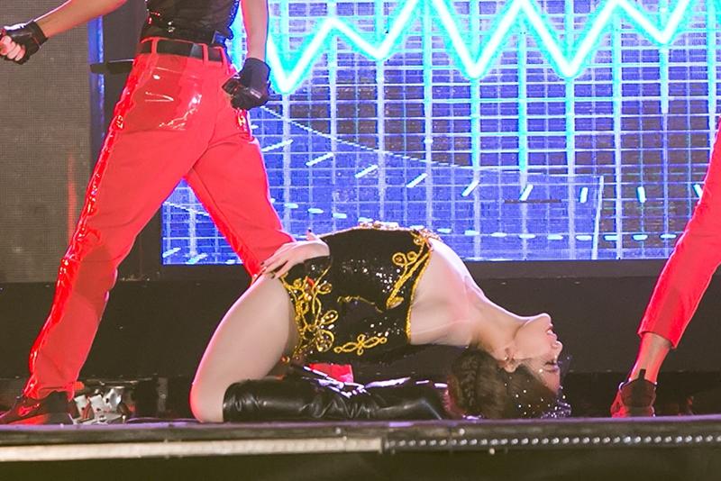 Ngay sau khi gây ấn tượng với sự xuất hiện của mình, Hoàng Thuỳ Linh đã trút bỏ chiếc áo choàng đỏ để quay trở về với phong cách sexy quen thuộc trong một mẫu thiết kế quen thuộc với phong cách trình diễn của Hoàng Thuỳ Linh, nhưng vẫn mang một hình dáng cow-girl chủ đạo.