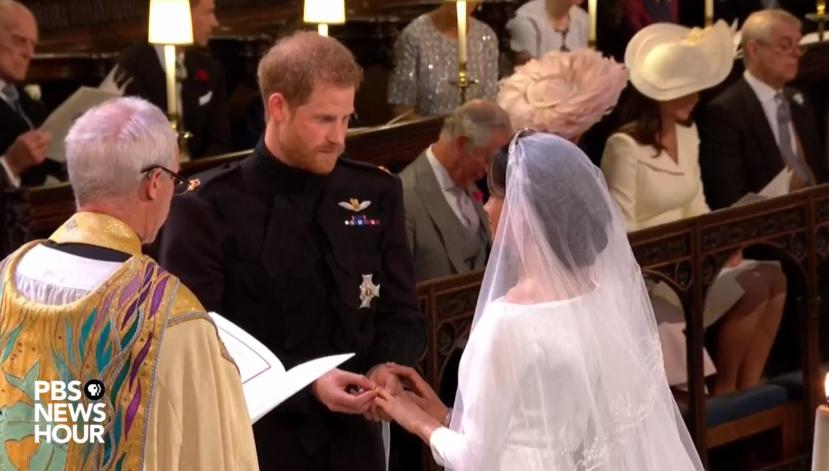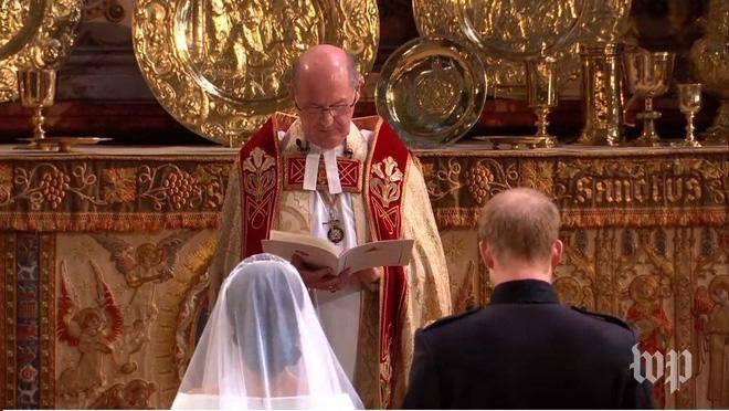 Hoàng tử Harry trao nhẫn cho Meghan. Giám mục Canterbury chủ trì lễ đọc lời thề nguyện. Sau khi Harry và Meghan đọc lời thề, Giám mục xứ Canterbury nói: “Ta tuyên bố hai con là vợ chồng”.