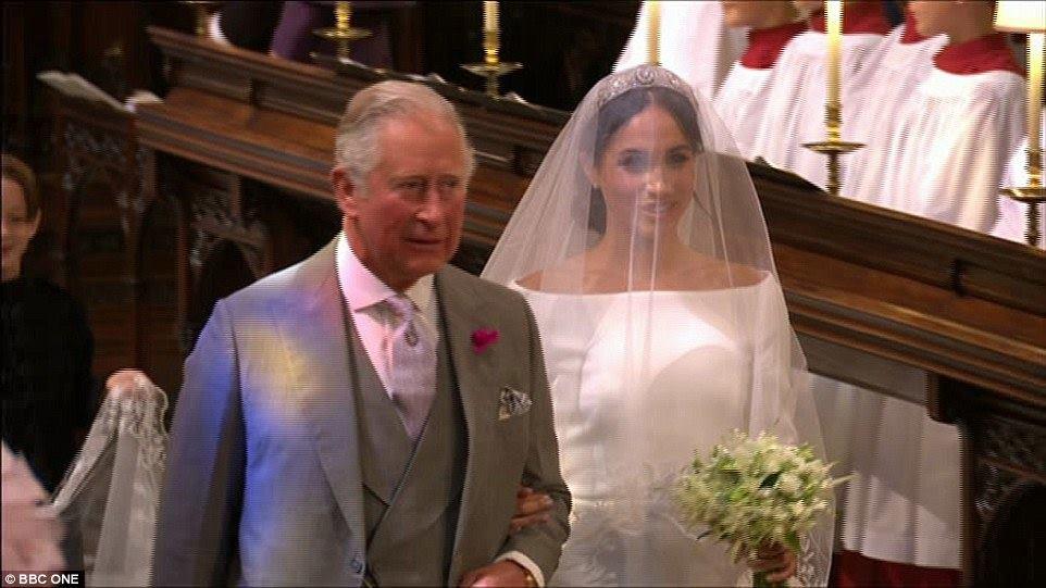 Thái tử Charles, cha của Hoàng tử Harry, cầm tay cô dâu Meghan tiến vào sảnh đường nhà nguyện St. George.