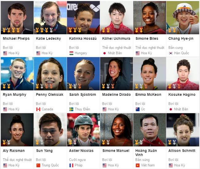 Một trong những bất ngờ lớn nhất chính là sự xuất hiện của Hoàng Xuan Vinh trong Top 20, xạ thủ của Việt Nam cùng chia sẻ vị trí với Raisman, Sun Yang, Nicolas, Manuel, Schmitt, và Michael Jung với 1 HCV và 1 HCB giành được.