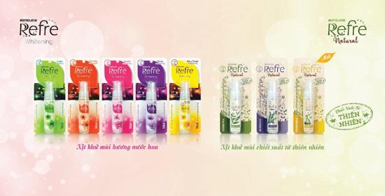 Refre có 2 dòng sản phẩm: xịt khử mùi Refre Whitening hương nước hoa (có dạng xịt và lăn) và xịt khử mùi Refre Natural chiết xuất từ thiên nhiên (dạng xịt). + Xịt khử mùi Refre Whitening hương nước hoa với 5 mùi hương nước hoa đại diện cho 5 phong cách: Deluxe - Hương sang trọng; Sweetie - Hương ngọt ngào; Baby Powder - Hương phấn thơm; Charming - Hương quyến rũ; Sophis - Hương tinh tế. + Xịt khử mùi Refre Natural chiết xuất từ thiên nhiên giúp khử mùi, ngăn tiết mồ hôi hiệu quả, thân thiện với mọi loại da. Có 3 lựa chọn cho bạn: Green Tea - Trà Xanh; Rosemary - Hương Thảo; Chamomile - Cúc La Mã. Quà tặng hấp dẫn: tặng kèm vòng cổ thời trang choker khi mua sản phẩm xịt khử mùi Refre bất kỳ.