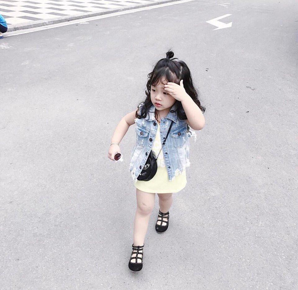 Khi đi dạo phố, bé Sam giản dị với khoác jean rách và váy xuông.