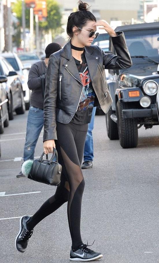 Có lẽ vì quá tự tin vào vóc dáng hoàn hảo của mình nên Kendall Jenner là ngôi sao nữ hiếm hoi luôn trung thành với những chiếc quần legging. Khỏi nói thì chắc bạn cũng tưởng tượng ra, kiểu quần ôm sát từ thắt lưng đến mắt cá chân ấy không hề dễ mặc một chút nào. Ngay cả người có vóc dáng khá chuẩn như Taylor Swift mới đây cũng phải khéo léo dùng áo che chắn khi diện legging vì sợ bị lộ phần nhạy cảm.