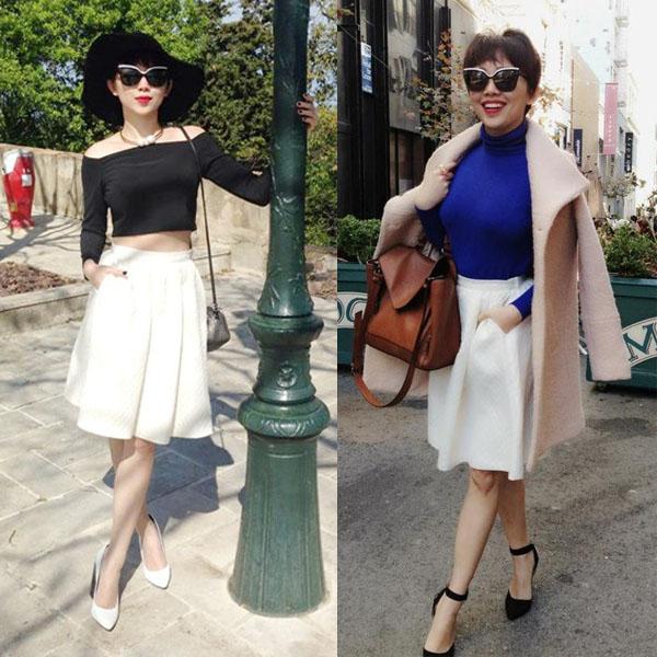 Chân váy trắng được Tóc Tiên phối thành công ở cả hai dạng thời tiết nóng và lạnh.