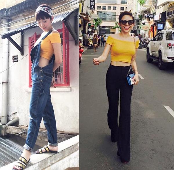 Crop-top vàng trễ vai phù hợp với quần yếm demi, xong cũng "kết đôi" với quần ống loe