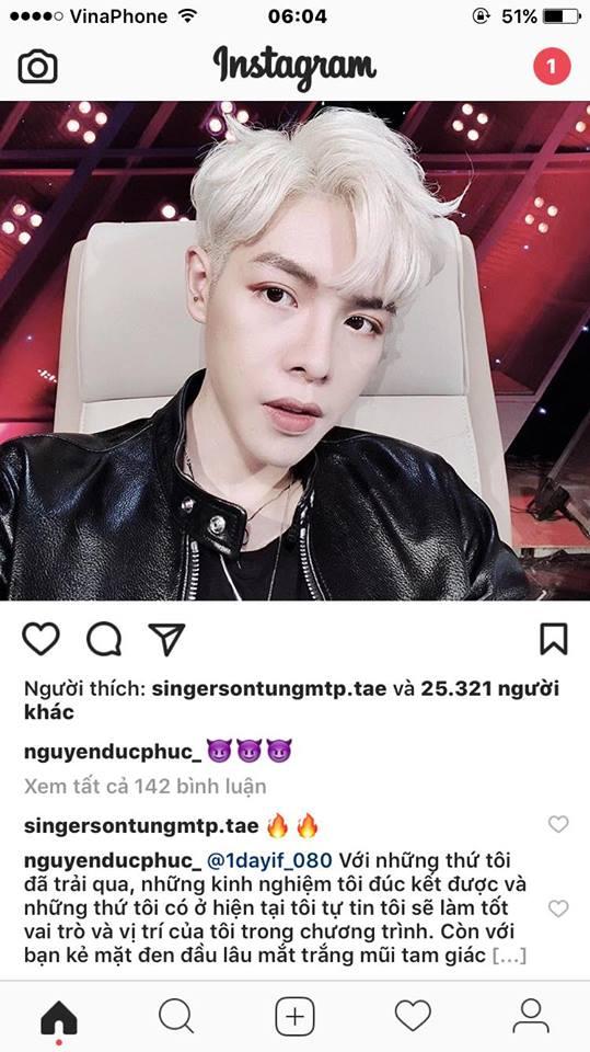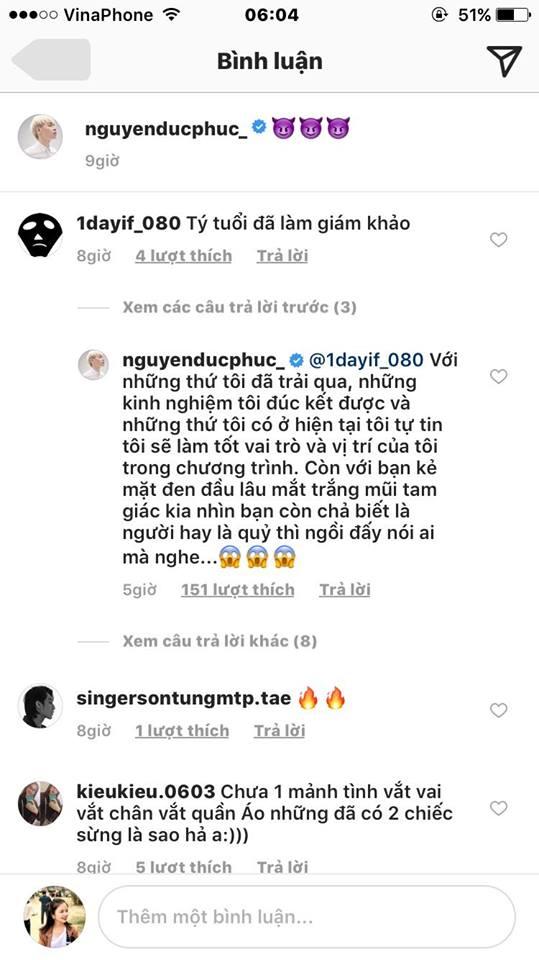 Mới đây nhất, antifan đã vào hẳn trang Instagram của anh để "đá đểu": "Tí tuổi đã làm giám khảo". Đứng trước bình luận này, Đức Phúc cũng lập tức phản pháo gay gắt. Cụ thể, anh đáp trả: "Với những thứ tôi đã trải qua, những kinh nghiệm tôi đúc kết được và những thứ tôi có ở hiện tại tôi tự tin tôi sẽ làm tốt vai trò và vị trí của tôi trong chương trình. Còn với bạn, kẻ mặt đen, đầu lâu, mắt trắng, mũi tam giác kia, nhìn bạn còn chả biết là người hay là quỷ thì ngồi đấy nói ai mà nghe".
