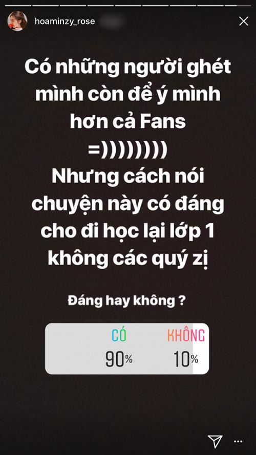 Một lần, khi bị antifan “vặn vẹo” chuyện không có hit, cô nàng đã đáp trả vô cùng “ngầu”. Nguyên văn: “Giờ nhỏ này là ca sĩ hay là diễn viên hài nhảm vậy. Google toàn thấy hoa dâm bụt gì gì đó mà không thấy bài hát nào”. Đáp lại bình luận này, Hòa Minzy không những không bực tức mà trái lại còn trả lời rất dí dỏm: “Chuẩn bị ra làm gì căng”.