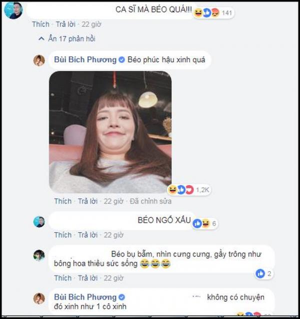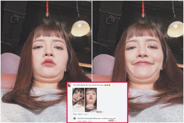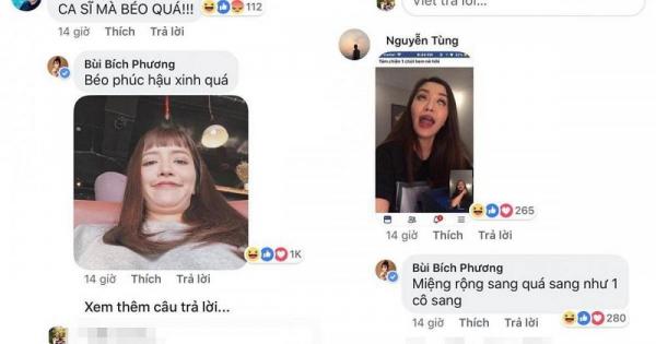 Trên trang cá nhân, khi bị fan trêu chọc, chê béo, Bích Phương lại có cách đáp trả không "không giống ai" và vẫn giữ độ "lầy lội", bá đạo. Khi bị chê "ca sĩ mà béo quá", nữ ca sĩ đã phản pháo bằng hình ảnh cằm nọng cùng dòng bình luận: "Béo phúc hậu xinh quá".