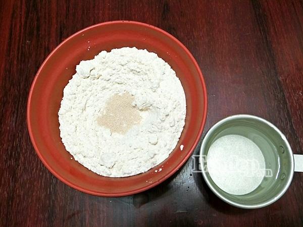 Bước 1: Cho bột mì, bột nở, men nở, vanilla vào 1 cái tô và trộn đều lên. Nước ấm, đường, muối cho vào bát hoặc cốc khuấy đều cho tan đường.