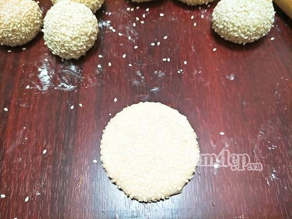 Bước 4: Cho miếng bột vào bát vừng trắng và lăn cho bánh bám đều 1 lớp vừng. Lấy bánh ra bàn và dùng cây cán bột cán sao cho có độ mỏng vừa là được. Bạn cứ làm như vậy cho hết chỗ bột còn lại.