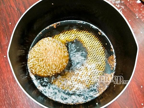 Bước 5: Cho nhiều dầu vào chảo, đun cho nóng dầu thì hạ lửa nhỏ, thả 1 cái bánh vào chiên và dùng đũa xoay nhẹ cho bánh nổi lên, sau đó lật mặt bánh và dùng 2 bên đầu đũa dìm nhẹ 2 bên mép bánh, như vậy bánh sẽ nở to phồng lên trông rất hấp dẫn.