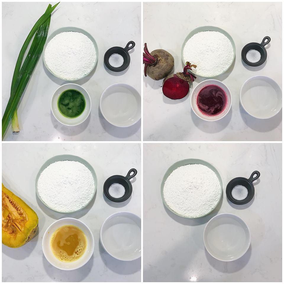 Lá dứa rửa sạch cho vào cối xay sinh tố cùng 50ml nước xay nhuyễn lọc lấy nước cốt. Tương tự với củ dền và bí đỏ.