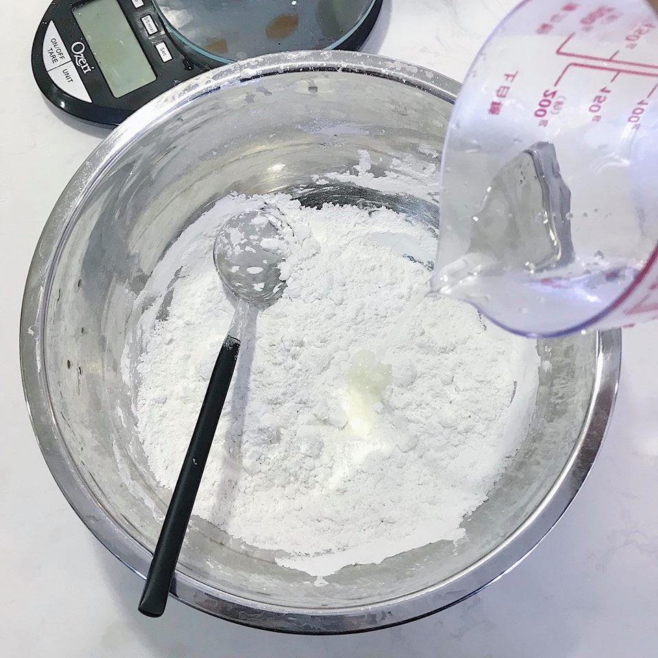 Trộn bột nếp với muối, nước màu và 100ml NƯỚC SÔI. Nhào đến khi được một cục bột mịn không dính tay. Bước này lượng nước các bạn có thể điều chỉnh nhiều ít tùy thuộc vào loại bột nếp bạn mua. Riêng với màu trắng thì là 150ml nước sôi nhé!