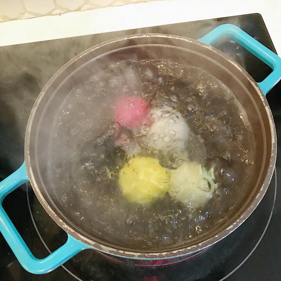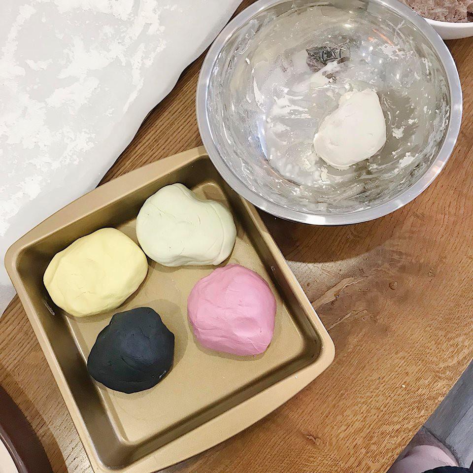 Nhào cho viên bột không dính tay. Để riêng từng viên. Nếu cẩn thận sau khi nặn mỗi màu thì nên rửa tay để tránh màu này dính sang màu khác.