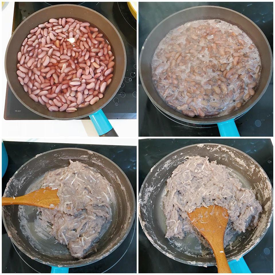 Đậu đỏ sau khi ngâm đun mềm với nước, sau đó cho vào máy xay xay nhuyễn mịn. Bắc lại lên chảo, cho đường và dừa tươi vào. Sên lửa nhỏ đến khi thành một khối nặn không dính tay là được.