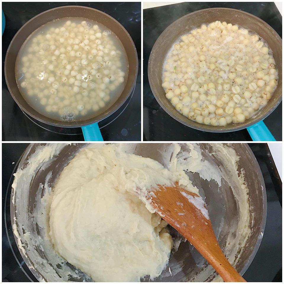 Hạt sen đun với nước cho mềm, xay nhuyên, cho lại lên chảo đổ đường vào sên đến khi thành một khối nặn không dính tay là được.