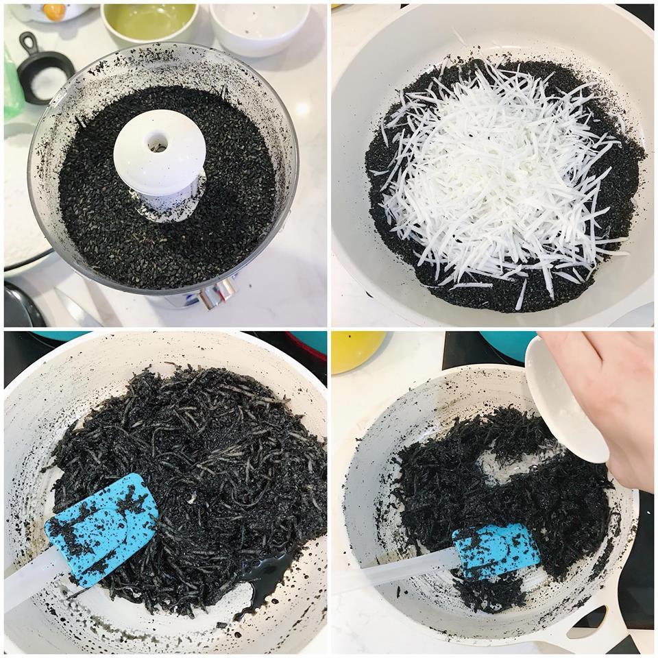 Vừng đen xay nhỏ, cho lên chảo, cho dừa tươi và đường vào. Đun đến khi dừa ngấm đường (có thể cho chút nước ở bước này để không bị cháy) sau đó hoà tan bột năng với 40ml nước và đổ vào, đảo đến khi hỗn hợp quyện đều là được.