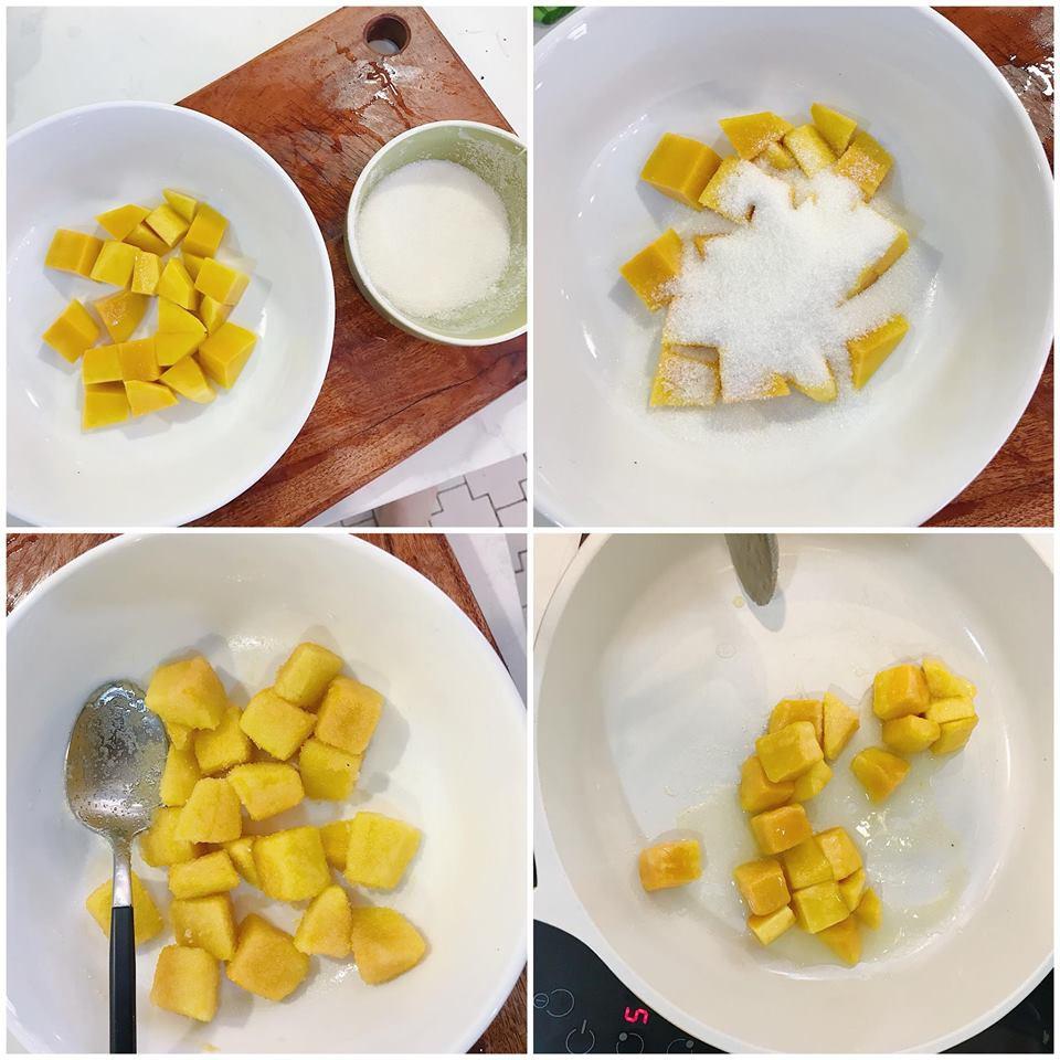 Xoài cắt hạt lựu, trộn với đường. Để ướp đến khi đường tan hết. Bắc lên chảo sên 5-7 phút là được. Để nguội.