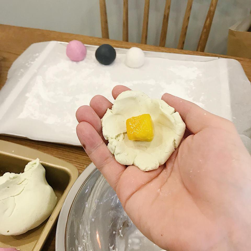 Lấy bột ra nặn bánh. Lượng bột gấp đôi lượng nhân. Cho nhân vào và vê thành viên tròn.