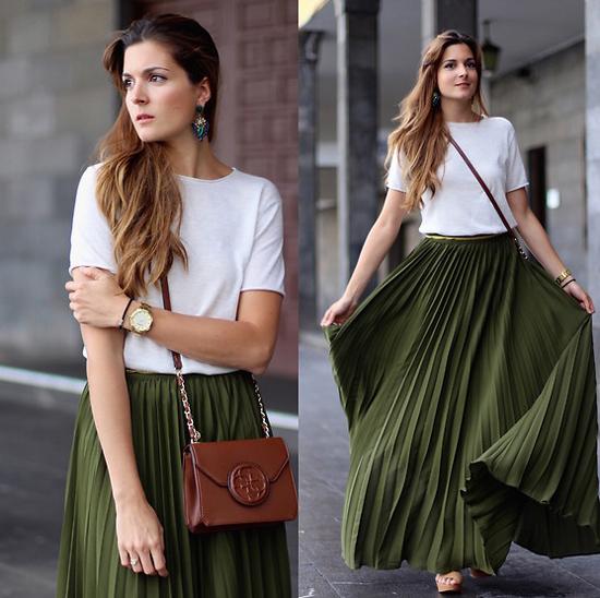 Set đồ với chân váy xếp ly dáng dài kết hợp áo phông như cô gái