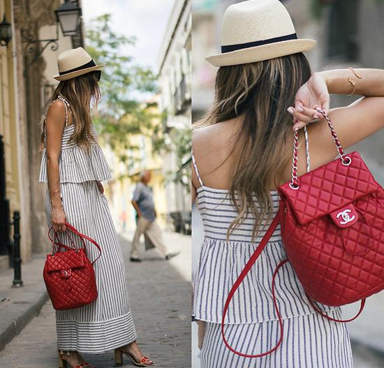 đồ kẻ sọc kết hợp ba lô đỏ rực rỡ. Mũ cói vành nhỏ là món đồ nên có