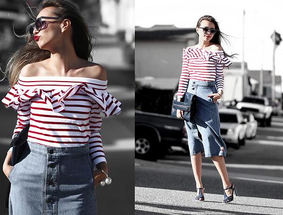 gợi cảm với áo kẻ sọc ngang trễ vai kết hợp chân váy midi denim. Sở