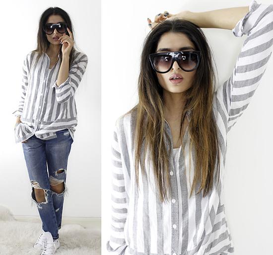 Áo sơ mi kẻ sọc, quần jeans rách, giày sneakers như cô gái Yatri P, ở Mỹ