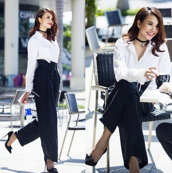 quần ống suông cạp cao như Thanh Hằng. Giày cao gót đính nơ, vòng cổ