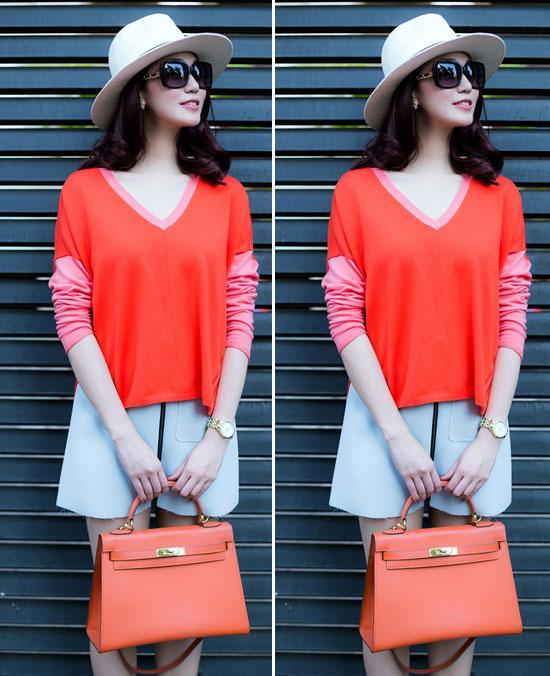 Áo đỏ, quần xanh nhẹ, túi Hermes màu cam dễ làm Khánh My gây chú
