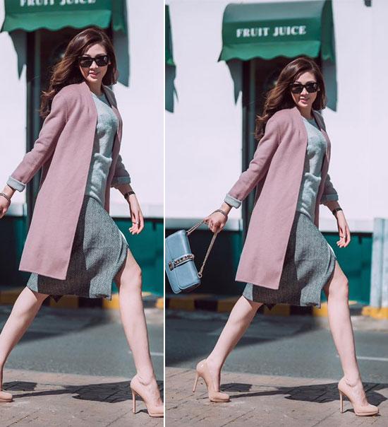 chiếc áo khoác màu xám và giày bạc lấp lánh như Hoàng Thùy sẽ khiến ngoại