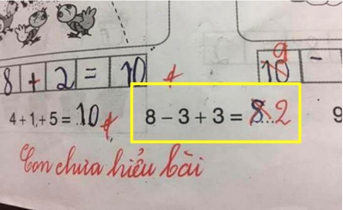 Trong bức ảnh đi kèm, học sinh giải bài Toán "8 – 3 + 3 = 8", nhưng cô giáo lại sửa đi với đáp án là 2. Cùng với đó, cô giáo phê trong bài thi là "Con chưa hiểu bài".