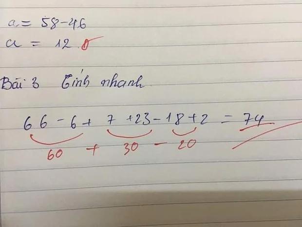 Hay chẳng hạn như ảnh chụp lại bài tập về nhà của một học sinh tiểu học với loạt phép tính như 38+15=54; 48+24=73; 68+13=82 hay 57+13=60; 62+28=80; 36+14=30; 42+28=60; 31+19=40 nhưng vẫn được cô giáo thản nhiên chấm đúng.