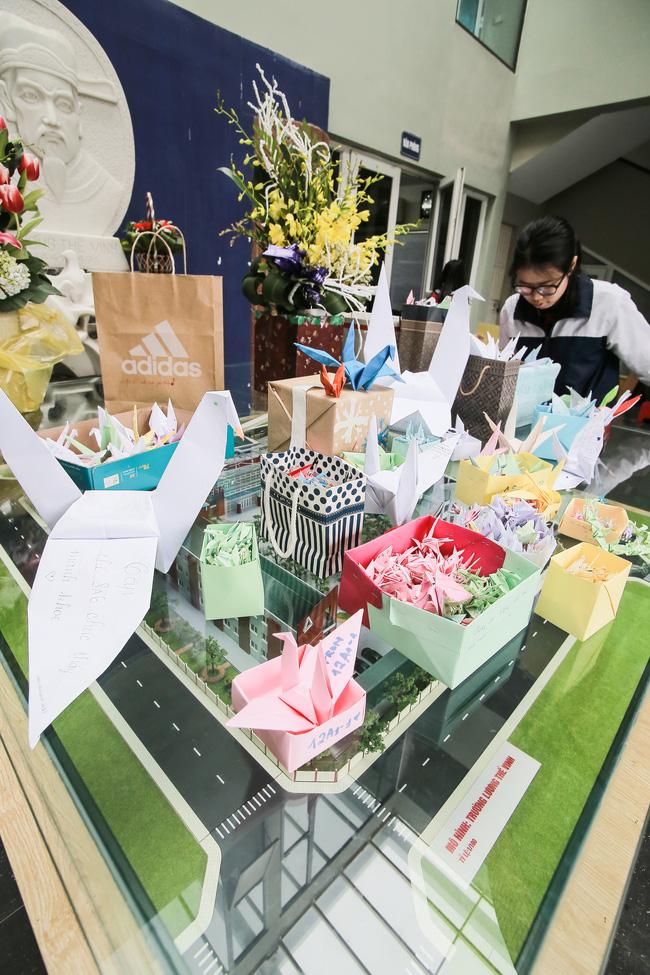 Bạn Hà Quang Nam (học sinh lớp 12A1) cho biết cậu phụ trách việc trông nom số hạc giấy này. Sau 3 ngày phát động chiến dịch, chiều qua, Nam và các bạn đã đếm được tất cả 12.000 hạc giấy với nhiều kích cỡ khác nhau.