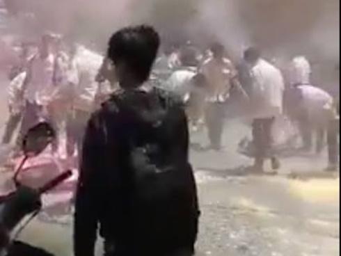 Hình ảnh nhóm học sinh thay nhau ném những túi bột màu vào sân trường. Ảnh cắt từ clip.