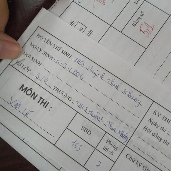 Chủ nhân bài thi này không biết vì áp lực thi cử hay vì quá yêu trường mà đã chọn "lấy tên trường thay tên mình". Ảnh: Nguyễn Thị Quỳnh Như.