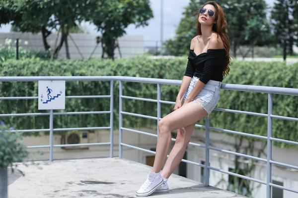 Sở hữu khuôn mặt lai tây ăn ảnh cùng vóc dáng cân đối là lợi thế giúp người đẹp lai dễ dàng nổi bật trong những shoot hình dù người đẹp chỉ đơn thuần diện áo thun trễ nải khoe bờ vai trần cùng quần short rách. Cặp kính râm, sneaker trắng là phụ kiện ăn ý hoàn thiện set trang phục của người đẹp.