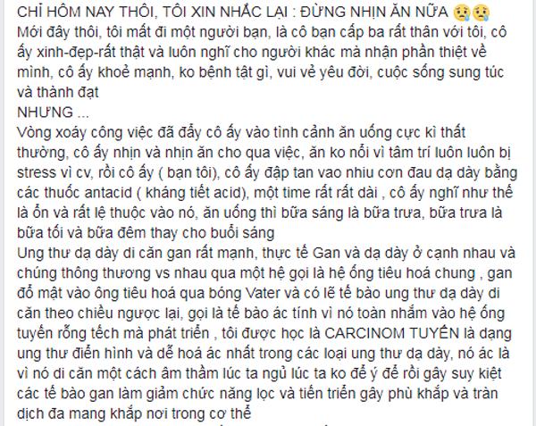 Mới đây, trên mạng xã hội xuất hiện bài tâm sự của một cô gái mới mất đi người bạn thân vì căn bệnh ung thư dạ dày. Cô bạn chỉ ra nguyên nhân dẫn đến thứ bệnh quái ác kia là do thói ăn nhịn ăn quá nhiều dẫn đến dạ dày bị tổn thương, chuyển sang ung thư di căn sang gan và lúc vào viện thì mọi chuyện đã quá muộn. Cùng với đó là lời cảnh tỉnh gửi đến những ai đã và đang nhịn ăn nên thay đổi thói quen xấu này.