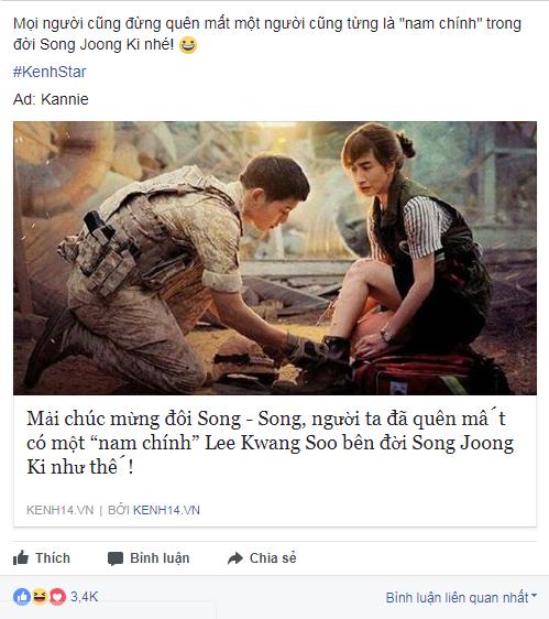 Ngoài những status chia sẻ cảm xúc hỗn loạn của chị em trong ngày hôm nay, còn có cả một lực lượng đông đảo chuyên chế ảnh cực hài hước về Song Joong Ki và người bạn thân Lee Kwang Soo - "hoàng tử châu Á". Hai mỹ nam này vốn rất thân thiết với nhau, đều là "hoa vô chủ" nên các fan mới thường trêu chọc gán ghép thành một đôi. Nay một "hoa" đã chuẩn bị lên xe bông, còn lại "hoàng tử" bơ vơ vẫn chưa có ai khuân về, nên dù đau lòng vật vã, chị em vẫn không thể nhịn cười trước những bức ảnh chế đại úy Yoo Shi Jin với chàng họ Lee. Đại úy đã bị cô y tá cướp mất thật rồi, không còn là mối tình trên phim nữa, ai cũng thấy thương thay cho "hoàng tử"!