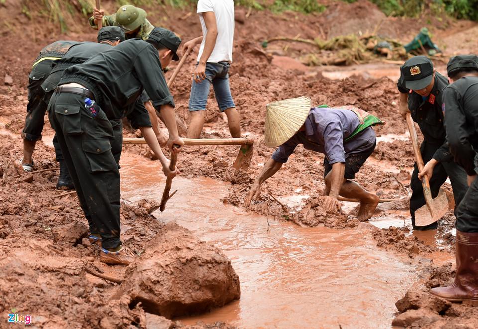 Thiếu tá Nguyễn Anh Sơn, Phó tham mưu trưởng trung đoàn 880, cho biết lực lượng điều động hơn 30 chiến sĩ xuống hiện trường từ ngày 25/6 để cùng địa phương tìm kiếm nạn nhân mất tích. Nhưng do mưa, đất đá sạt lở khối lượng lớn nên khó khăn cho việc tìm kiếm.