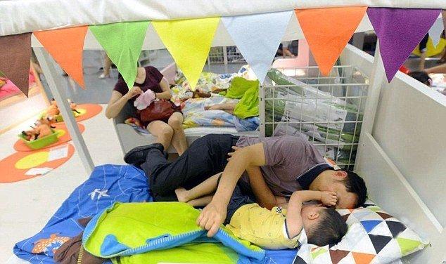 Mặc dù là giường ngủ trẻ em trưng bày cho khách hàng nhưng những người dân vô tư chiếm dụng để ngủ nghỉ cùng con em của mình.