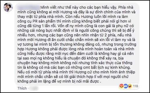 Bịa chuyện hay không mình không nói, nhưng tính xác thực của thông tin là không có mà các bạn có những bình luận bất lịch sự kinh khủng. Nếu có mời từ phía nhà mình thì Hương cứ cho mình hình ảnh thiệp mời, mình chắc chắn sẽ có lời giải thích hợp lý với mọi người chứ không phải im lặng để vợ mình bị nói mãi được".