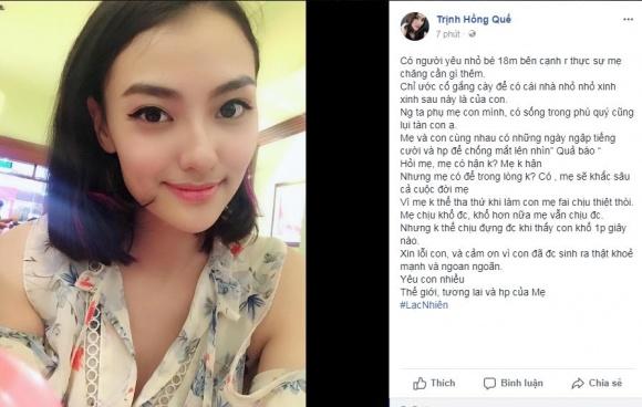 Mới đây trên trang Facebook cá nhân, Hồng Quế tâm sự: "Có người yêu nhỏ bé 18 tháng bên cạnh rồi thực sự mẹ chẳng cần gì thêm. Chỉ ước cố gắng cày để có cái nhà nhỏ nhỏ xinh xinh sau này là của con. Người ta phụ mẹ con mình, có sống trong phú quý cũng lụi tàn con ạ.