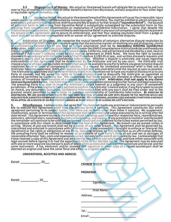 Để hoàn toàn giữ bí mật, Charlie Sheen đã soạn thảo một bản hợp đồng cặn kẽ và chi tiết cho các nhân tình của mình.